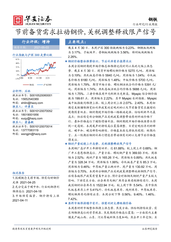【华安证券】【20210503】20210503-华安证券-钢铁行业周报:节前备货需求拉动钢价,关税调整释放限产信号-28页
