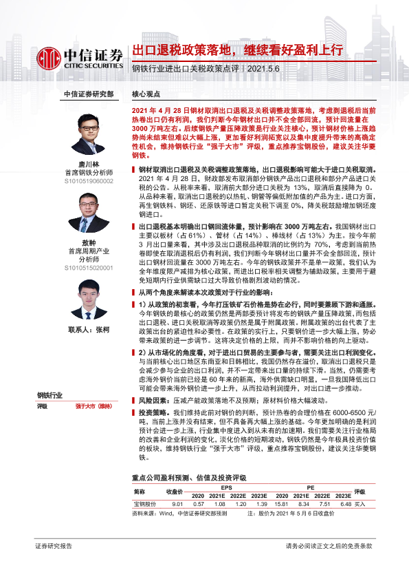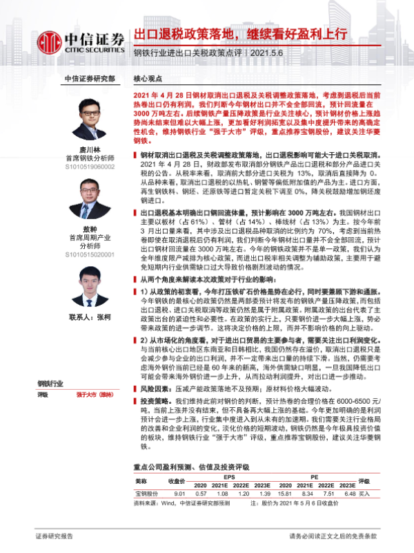 【中信证券】【20210506】钢铁行业进出口关税政策点评:出口退税政策落地,继续看好盈利上行-2页
