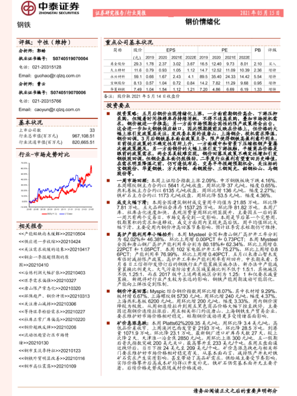 【中泰证券】【20210515】20210515-中泰证券-钢铁行业周报:钢价情绪化-13页