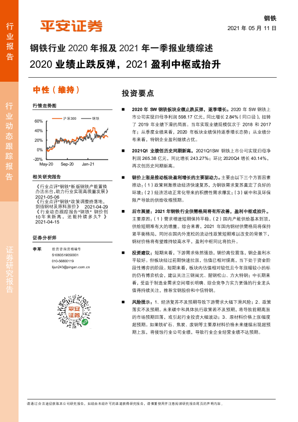 【平安证券】【20210511】钢铁行业2020年报及2021年一季报业绩综述:2020业绩止跌反弹,2021盈利中枢或抬升-15页