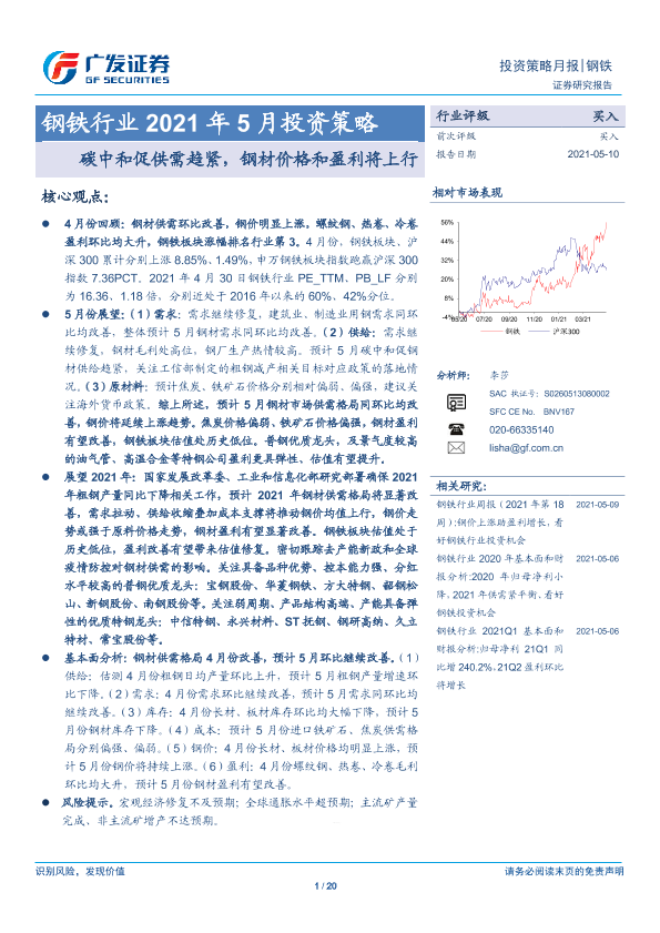 【广发证券】【20210510】钢铁行业2021年5月投资策略:碳中和促供需趋紧,钢材价格和盈利将上行-20页