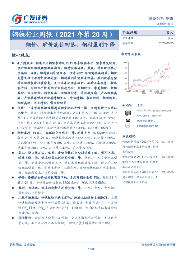 【广发证券】【20210523】20210523-广发证券-钢铁行业周报(2021年第20周):钢价、矿价高位回落,钢材盈利下降-26页