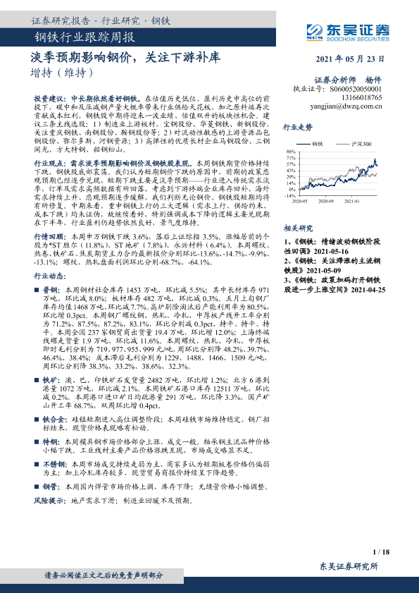 【东吴证券】【20210523】20210523-东吴证券-钢铁行业跟踪周报:淡季预期影响钢价,关注下游补库-18页