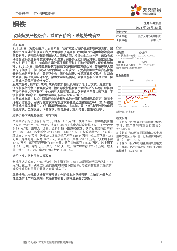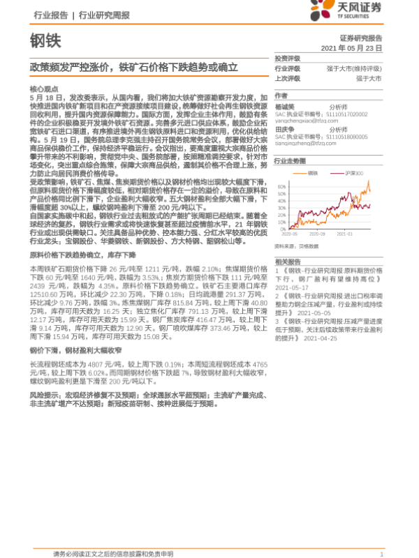 【天风证券】【20210523】20210523-天风证券-钢铁行业研究周报:政策频发严控涨价,铁矿石价格下跌趋势或确立-13页