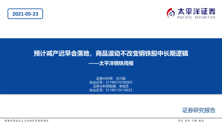 【太平洋证券】【20210523】20210523-太平洋-钢铁周报:预计减产迟早会落地,商品波动不改变钢铁股中长期逻辑-54页