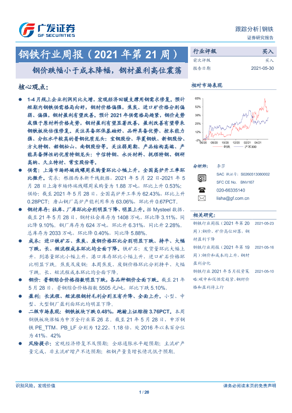 【广发证券】【20210530】钢铁行业周报(2021年第21周):钢价跌幅小于成本降幅,钢材盈利高位震荡-26页