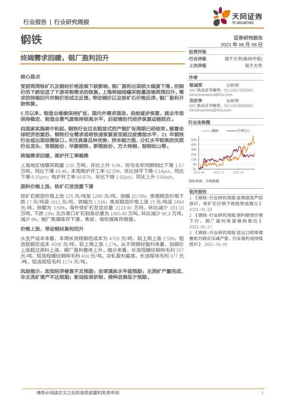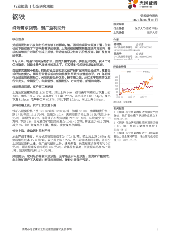【天风证券】【20210606】20210606-天风证券-钢铁行业研究周报:终端需求回暖,钢厂盈利回升-13页