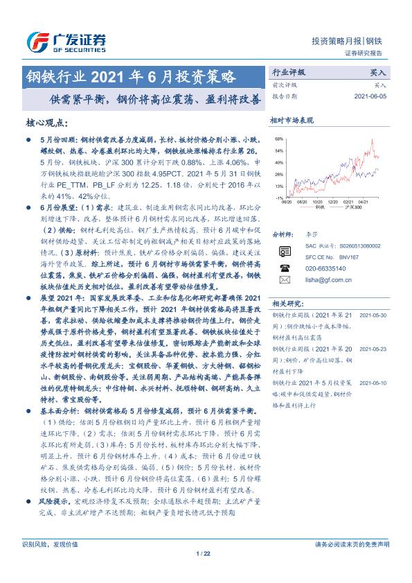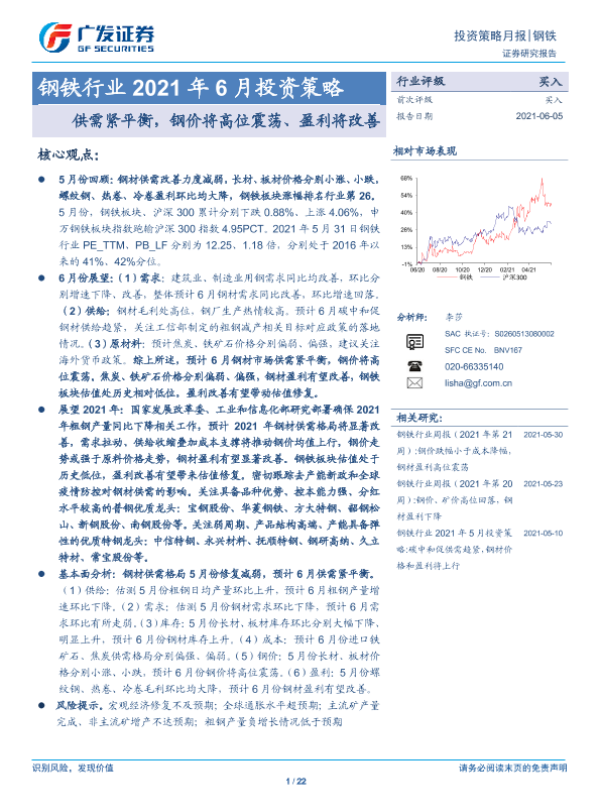 【广发证券】【20210605】钢铁行业2021年6月投资策略:供需紧平衡,钢价将高位震荡、盈利将改善-22页