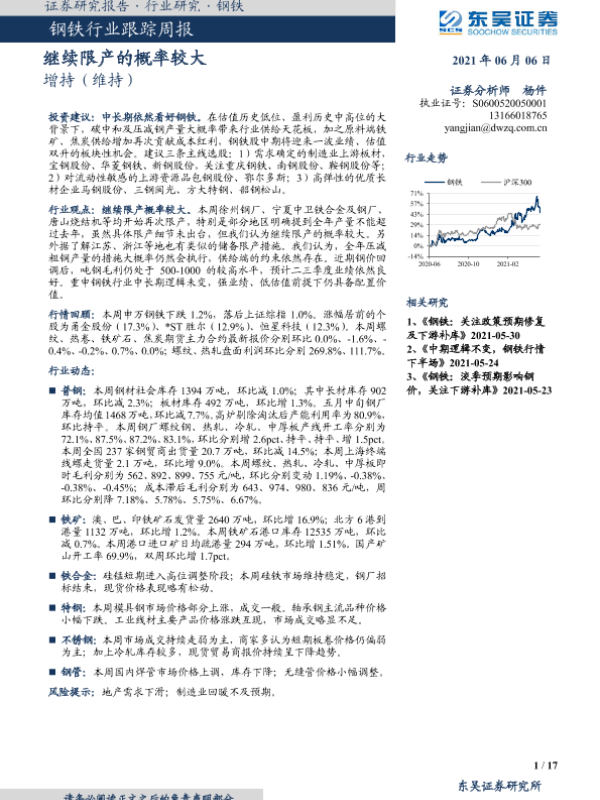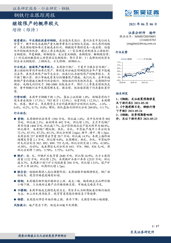 【东吴证券】【20210606】20210606-东吴证券-钢铁行业跟踪周报:继续限产的概率较大-17页