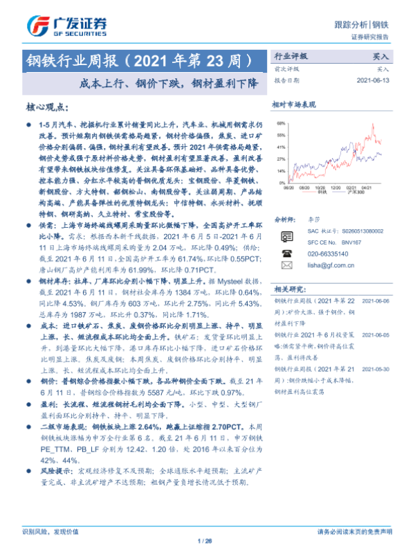【广发证券】【20210613】20210613-广发证券-钢铁行业周报(2021年第23周):成本上行、钢价下跌,钢材盈利下降-26页