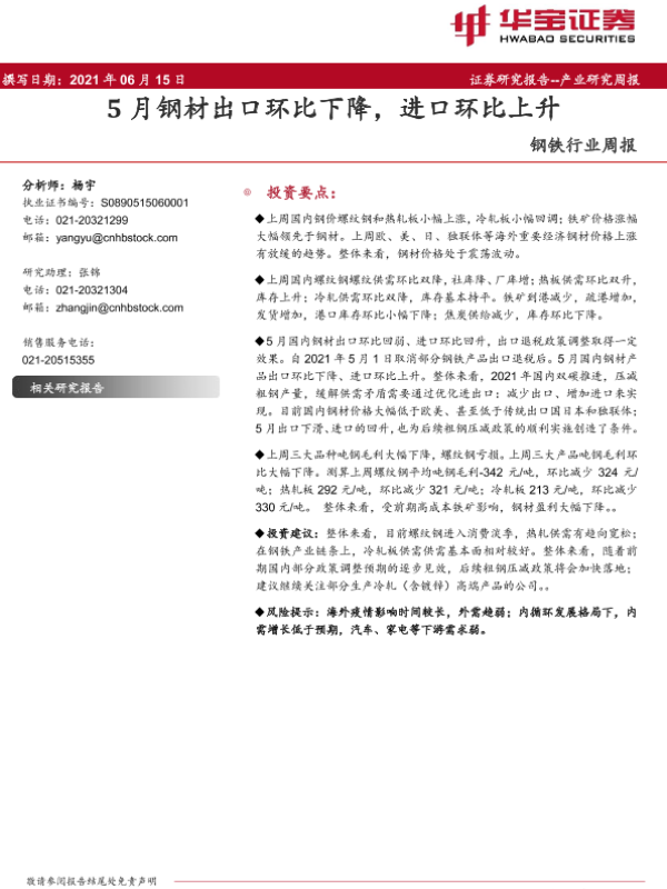 【华宝证券】【20210615】20210615-华宝证券-钢铁行业周报:5月钢材出口环比下降,进口环比上升-12页