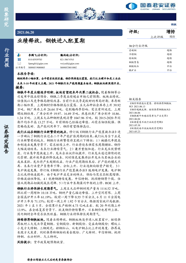 【国泰君安证券】【20210620】20210620-国泰君安-钢铁行业周报:业绩释放,钢铁进入配置期-20页