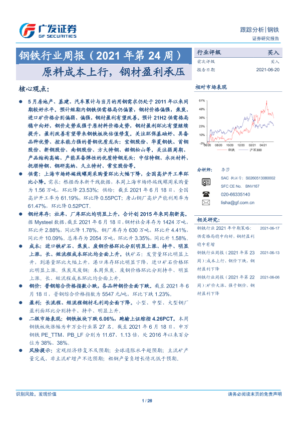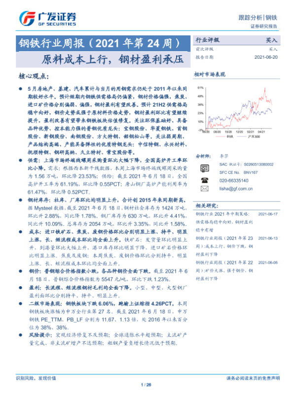 【广发证券】【20210620】20210620-广发证券-钢铁行业周报(2021年第24周):原料成本上行,钢材盈利承压-26页