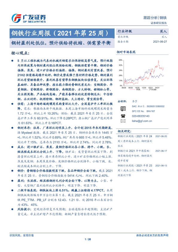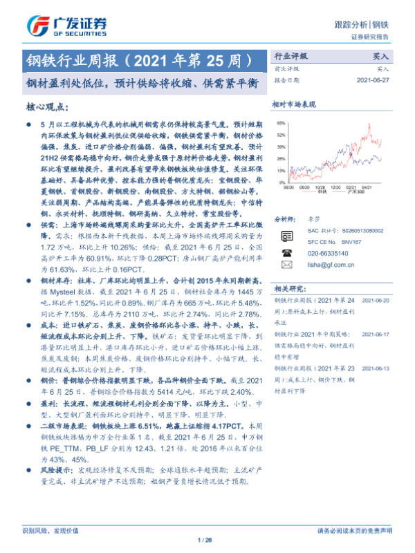 【广发证券】【20210627】20210627-广发证券-钢铁行业周报(2021年第25周):钢材盈利处低位,预计供给将收缩、供需紧平衡-26页
