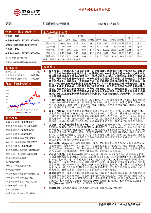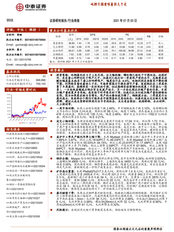 【中泰证券】【20210703】20210703-中泰证券-钢铁行业周报:吨钢亏损意味着供大于求-12页