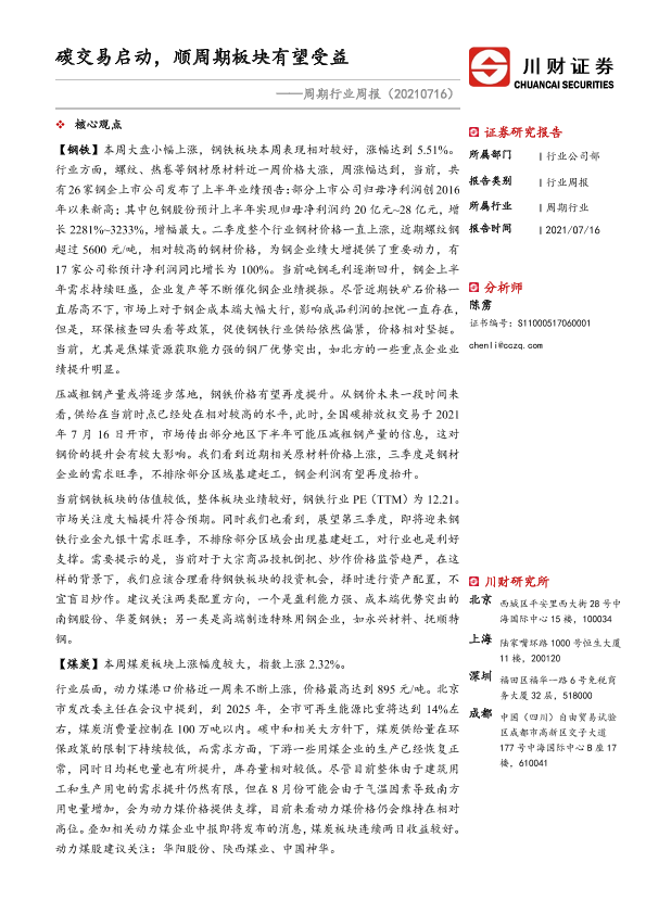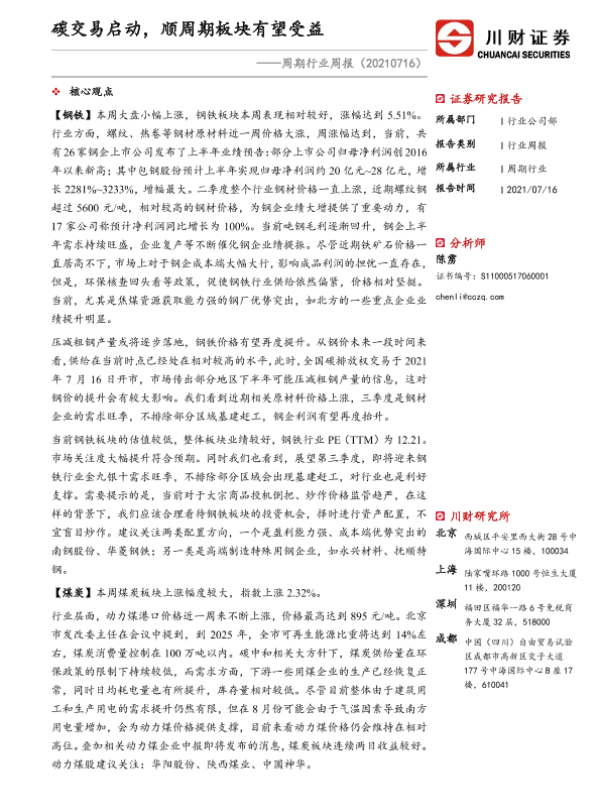 【川财证券】【20210716】周期行业周报:碳交易启动,顺周期板块有望受益-14页