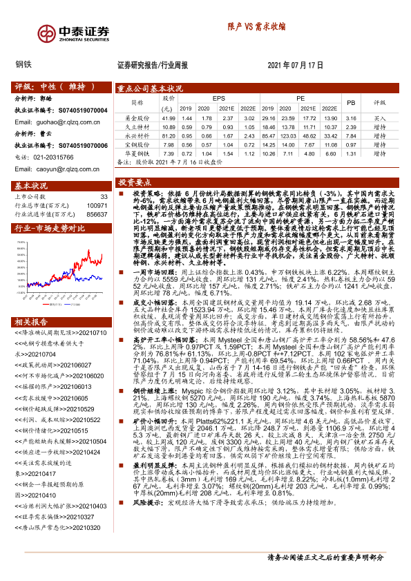 【中泰证券】【20210717】中泰证券-钢铁行业周报:限产VS需求收缩-12页