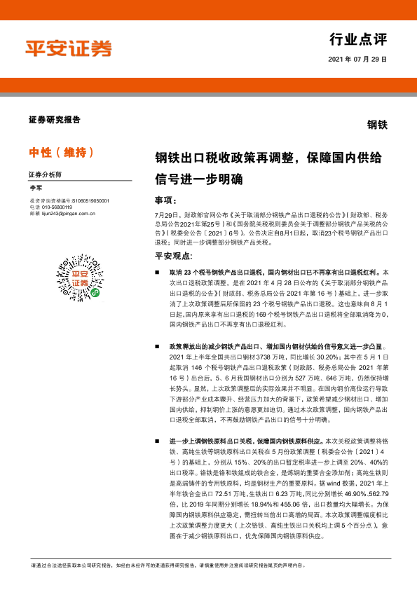 【平安证券】【20210729】钢铁行业点评:钢铁出口税收政策再调整,保障国内供给信号进一步明确-3页