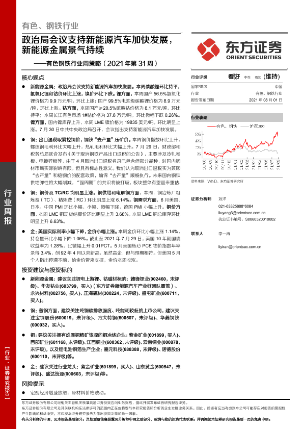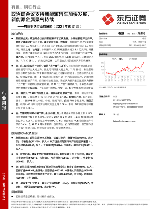 【东方证券】【20210801】20210801-东方证券-有色钢铁行业周策略(2021年第31周):政治局会议支持新能源汽车加快发展,新能源金属景气持续-27页