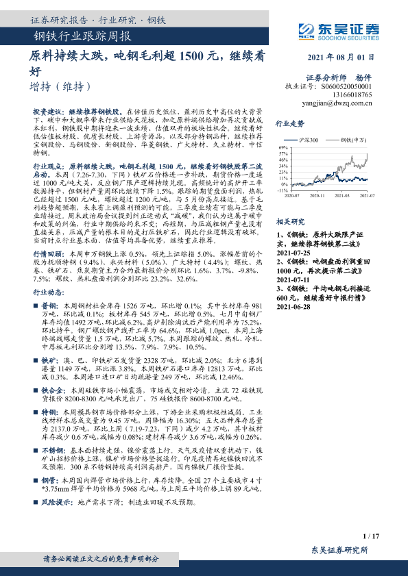 【东吴证券】【20210801】20210801-东吴证券-钢铁行业跟踪周报:原料持续大跌,吨钢毛利超1500元,继续看好-17页