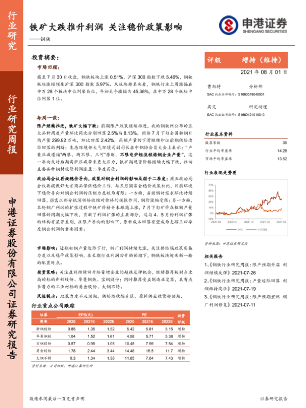 【申港证券】【20210801】20210801-申港证券-钢铁行业研究周报:铁矿大跌推升利润 关注稳价政策影响-6页