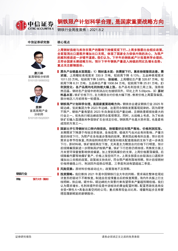 【中信证券】【20210802】20210802-中信证券-钢铁行业周度聚焦:钢铁限产计划科学合理,是国家重要战略方向-8页