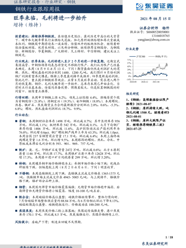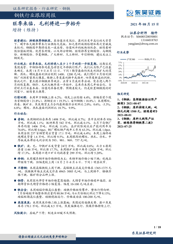 【东吴证券】【20210815】20210815-东吴证券-钢铁行业跟踪周报:旺季来临,毛利将进一步抬升-18页