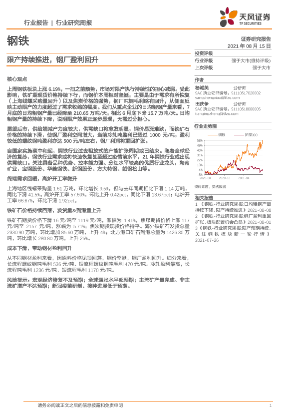 【天风证券】【20210815】20210815-天风证券-钢铁行业研究周报:限产持续推进,钢厂盈利回升-13页