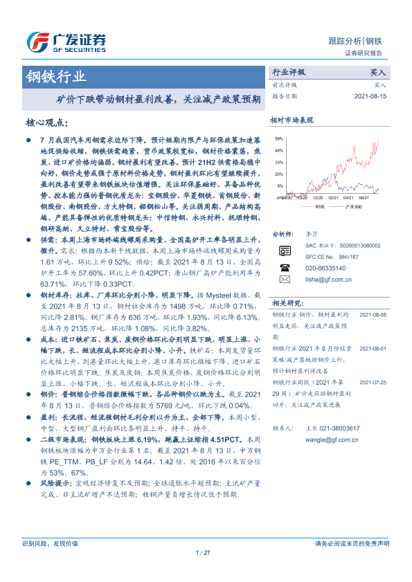 【广发证券】【20210815】矿价下跌带动钢材盈利改善,关注减产政策预期-27页