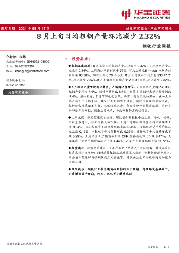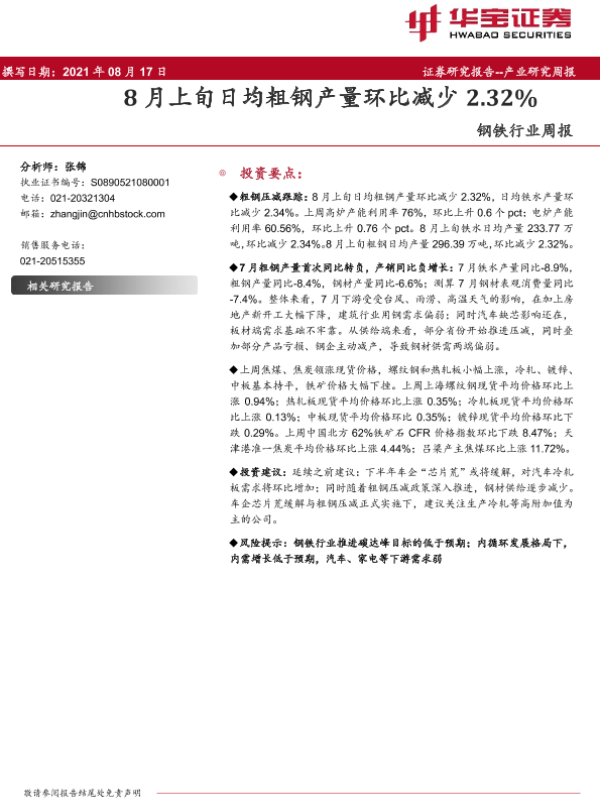 【华宝证券】【20210817】20210817-华宝证券-钢铁行业周报:8月上旬日均粗钢产量环比减少2.32%-11页