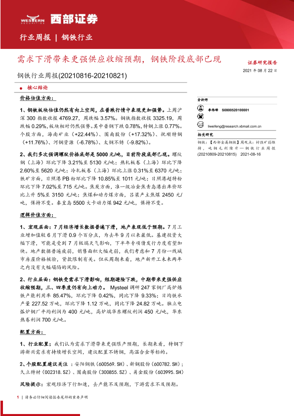 【西部证券】【20210822】20210822-西部证券-钢铁行业周报:需求下滑带来更强供应收缩预期,钢铁阶段底部已现-12页