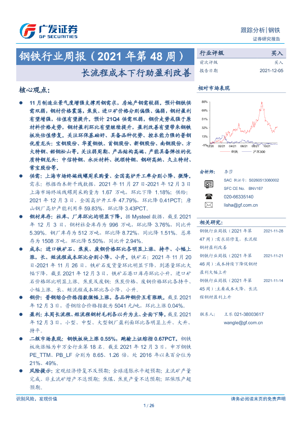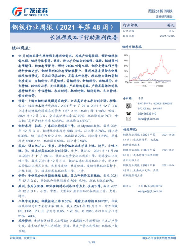 【广发证券】【20211205】20211205-广发证券-钢铁行业周报(2021年第48周):长流程成本下行助盈利改善-26页