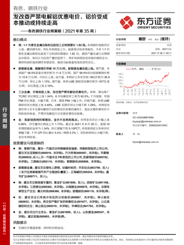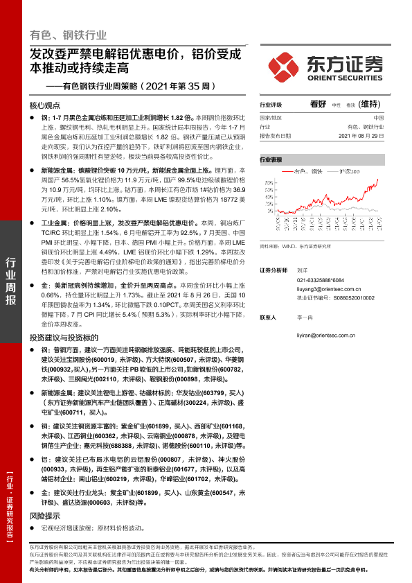 【东方证券】【20210829】有色钢铁行业周策略(2021年第35周):发改委严禁电解铝优惠电价,铝价受成本推动或持续走高-28页