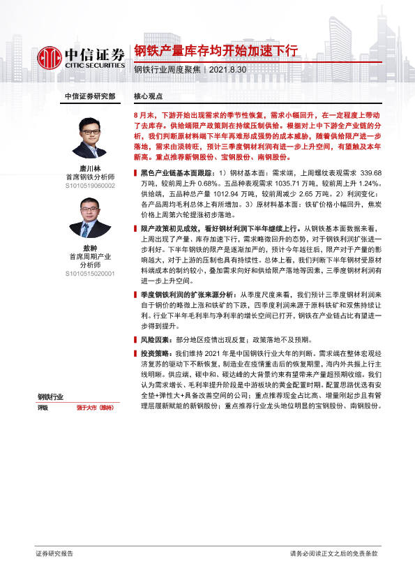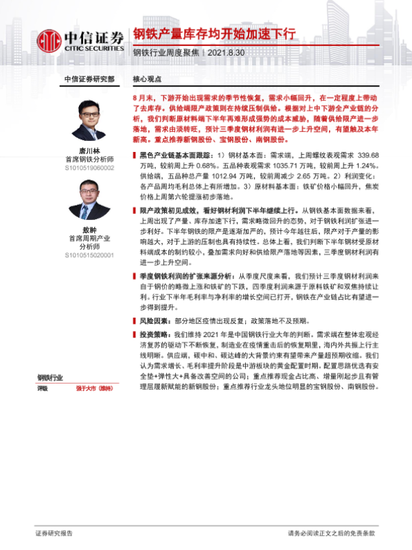 【中信证券】【20210830】钢铁行业周度聚焦:钢铁产量库存均开始加速下行-8页