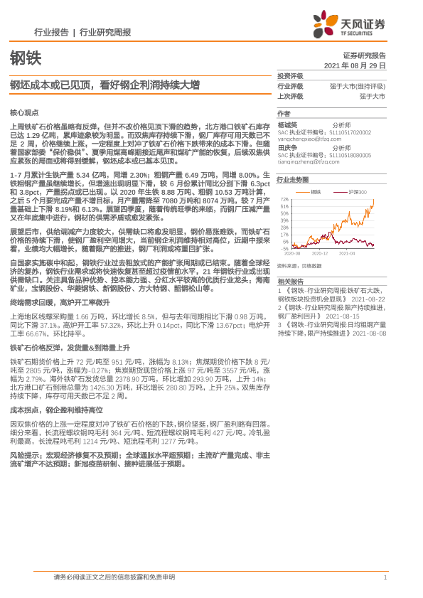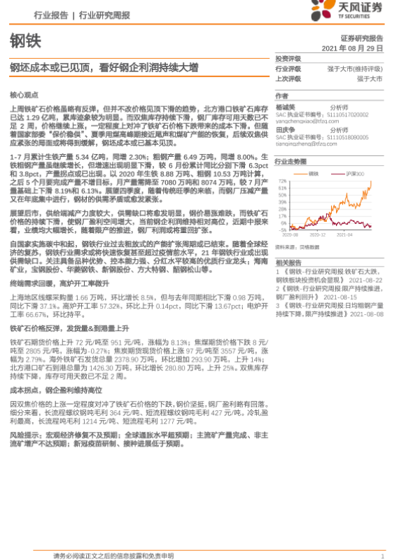 【天风证券】【20210829】20210829-天风证券-钢铁行业报告:钢坯成本或已见顶,看好钢企利润持续大增-13页