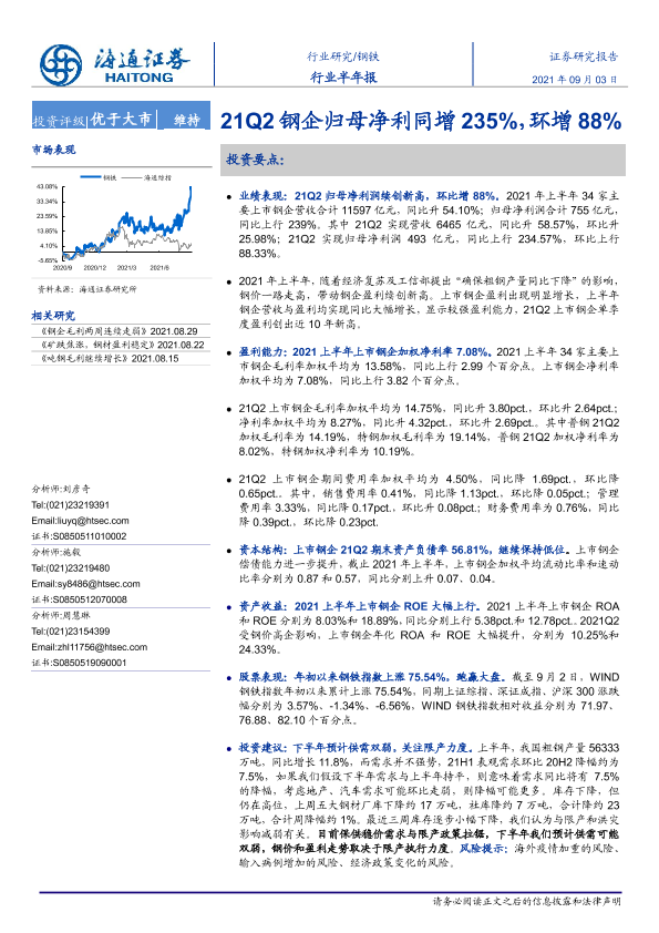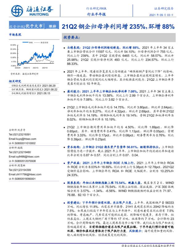 【海通证券】【20210903】20210903-海通证券-钢铁行业半年报:21Q2钢企归母净利同增235%,环增88%-13页