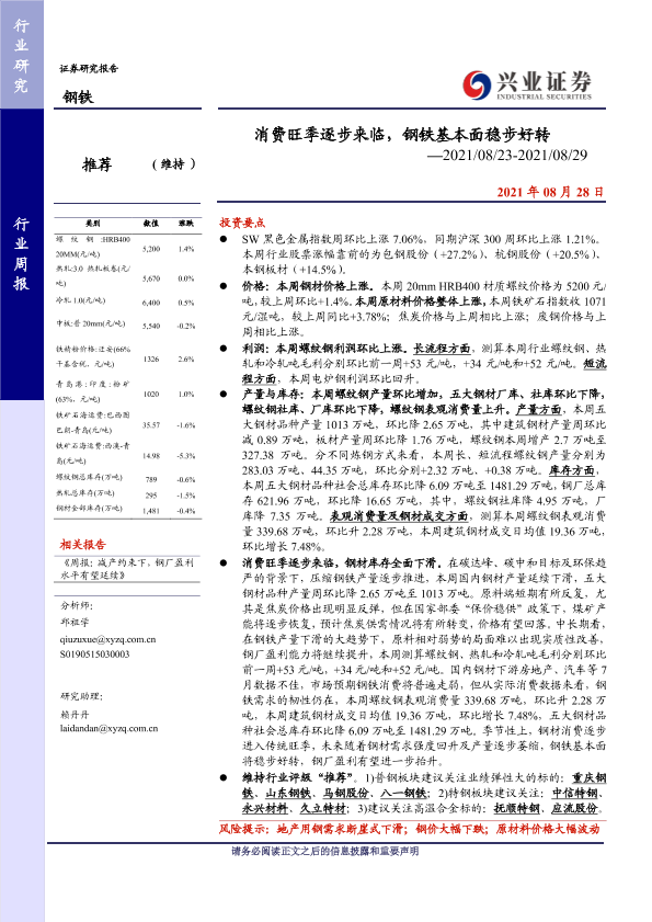 【兴业证券】【20210828】消费旺季逐步来临,钢铁基本面稳步好转-17页