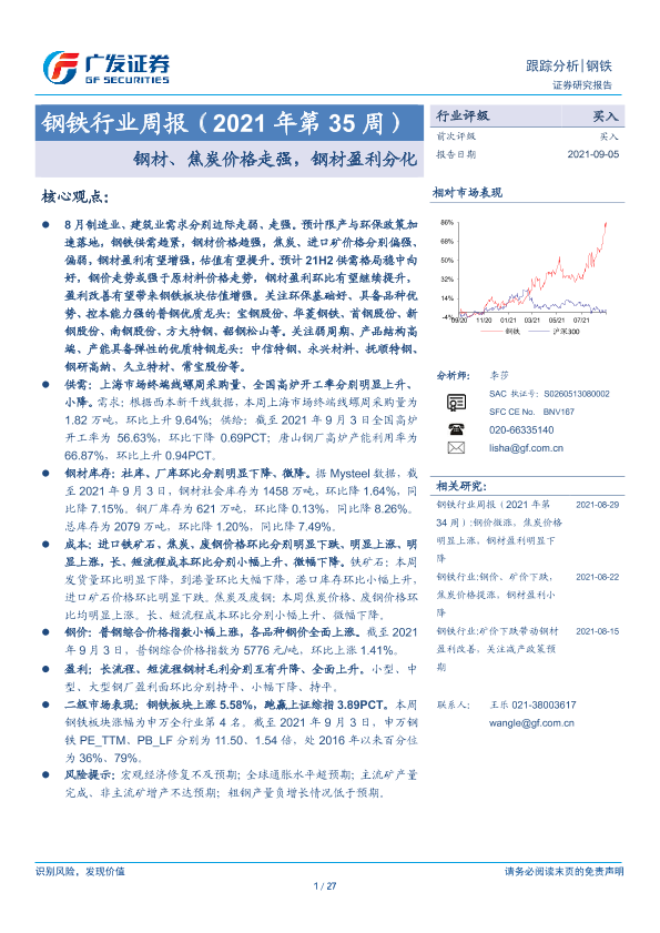 【广发证券】【20210905】20210905-广发证券-钢铁行业周报(2021年第35周):钢材、焦炭价格走强,钢材盈利分化-27页