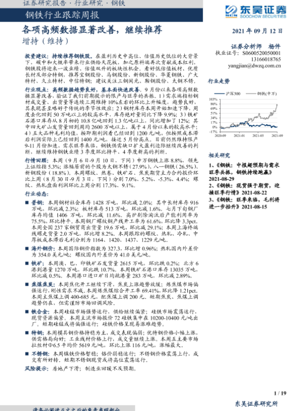 【东吴证券】【20210912】20210912-东吴证券-钢铁行业跟踪周报:各项高频数据显著改善,继续推荐-19页