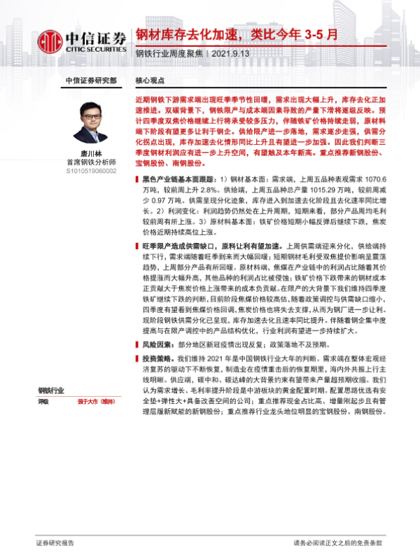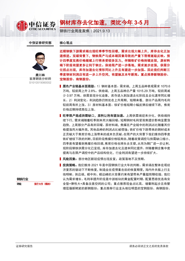 【中信证券】【20210913】20210913-中信证券-钢铁行业周度聚焦:钢材库存去化加速,类比今年3-5月-9页