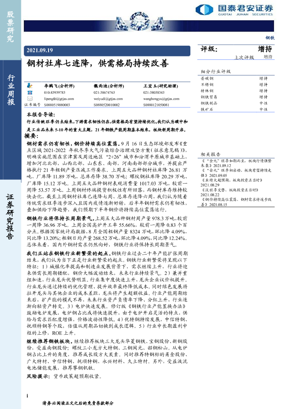【国泰君安证券】【20210919】20210919-国泰君安-钢铁行业周报:钢材社库七连降,供需格局持续改善-20页