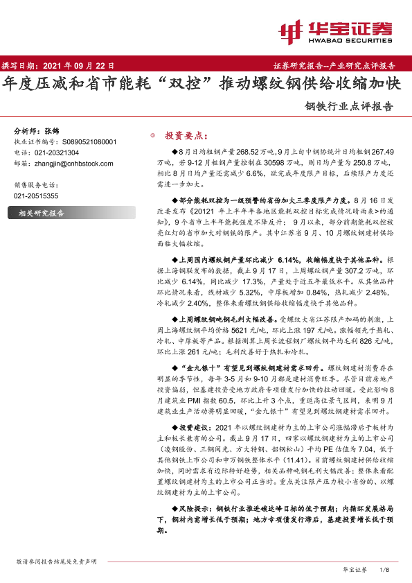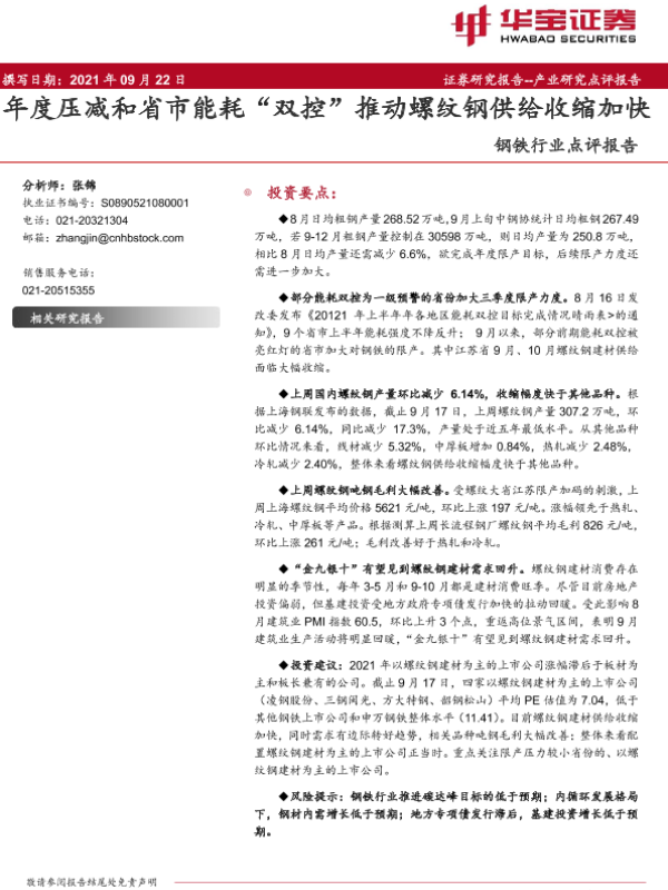 【华宝证券】【20210922】20210922-华宝证券-钢铁行业点评报告:年度压减和省市能耗“双控”推动螺纹钢供给收缩加快-8页