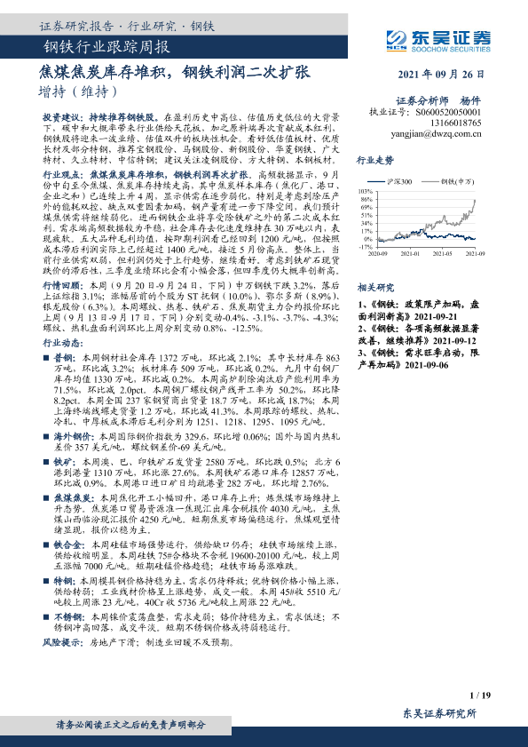 【东吴证券】【20210926】20210926-东吴证券-钢铁行业跟踪周报:焦煤焦炭库存堆积,钢铁利润二次扩张-19页