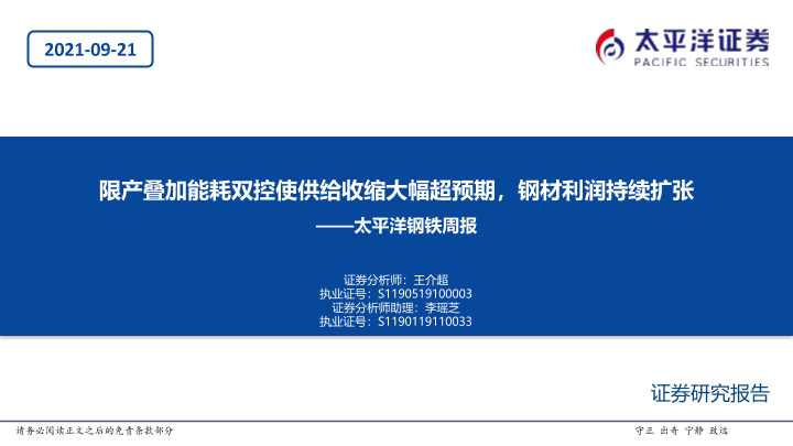 【太平洋证券】【20210921】20210921-太平洋-钢铁周报:限产叠加能耗双控使供给收缩大幅超预期,钢材利润持续扩张-52页