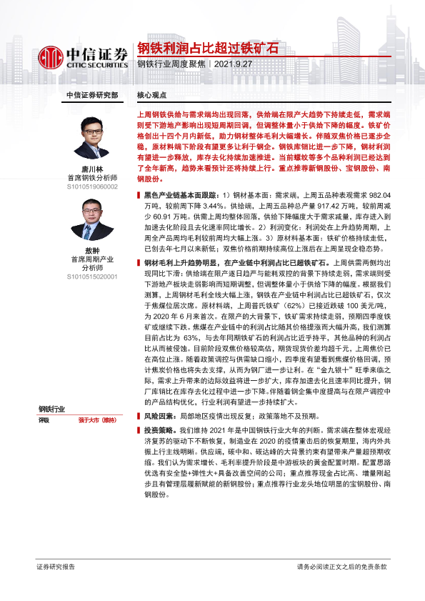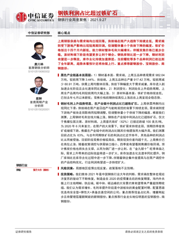 【中信证券】【20210927】钢铁行业周度聚焦:钢铁利润占比超过铁矿石-11页