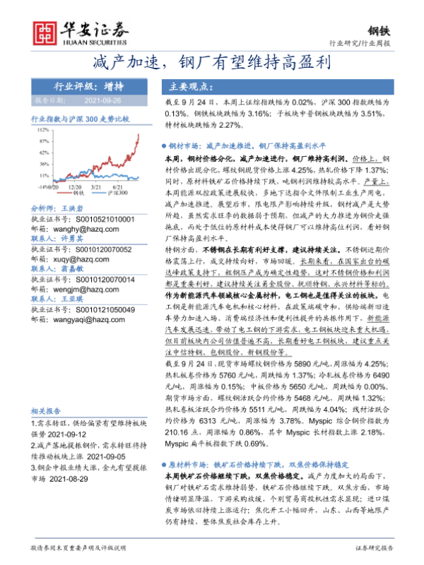 【华安证券】【20210926】20210926-华安证券-钢铁行业周报:减产加速,钢厂有望维持高盈利-24页