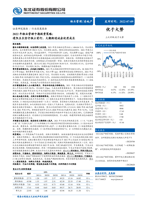 【东北证券】【20220709】2022年物业管理行业中期投资策略:道阻且长坚守独立前行,大潮渐退试金优质成长-38页