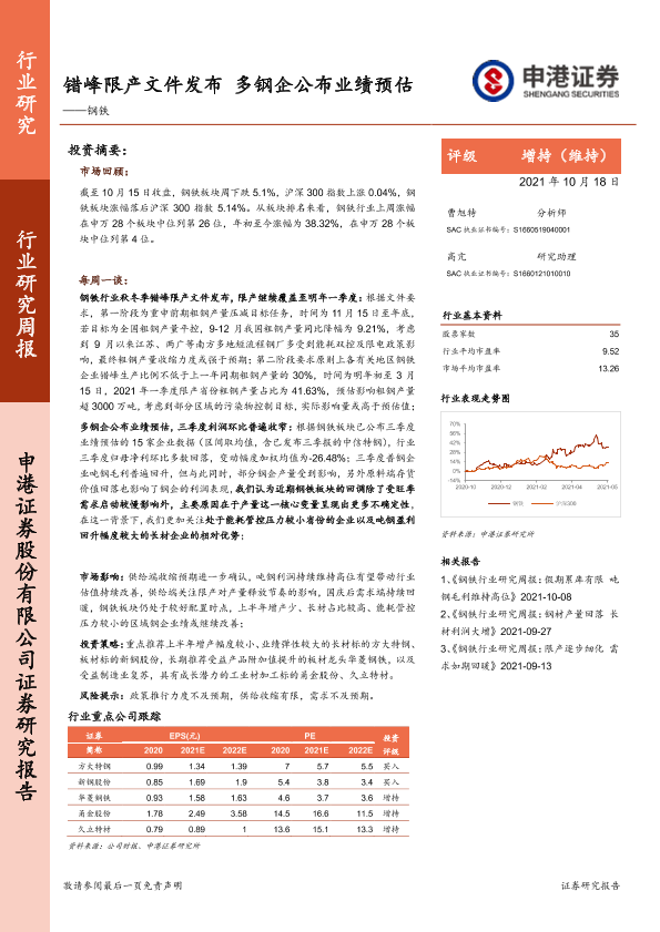 【申港证券】【20211018】钢铁行业研究周报:错峰限产文件发布 多钢企公布业绩预估-6页