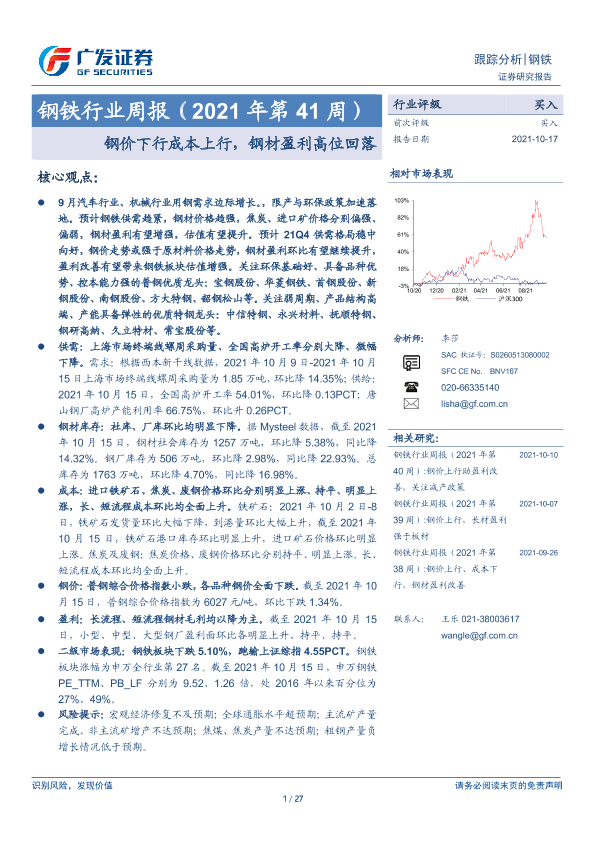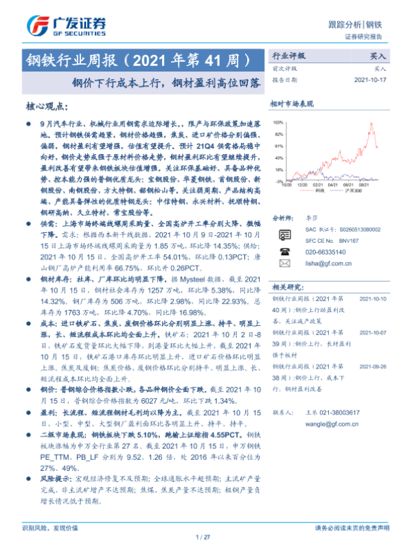 【广发证券】【20211017】钢铁行业周报(2021年第41周):钢价下行成本上行,钢材盈利高位回落-27页