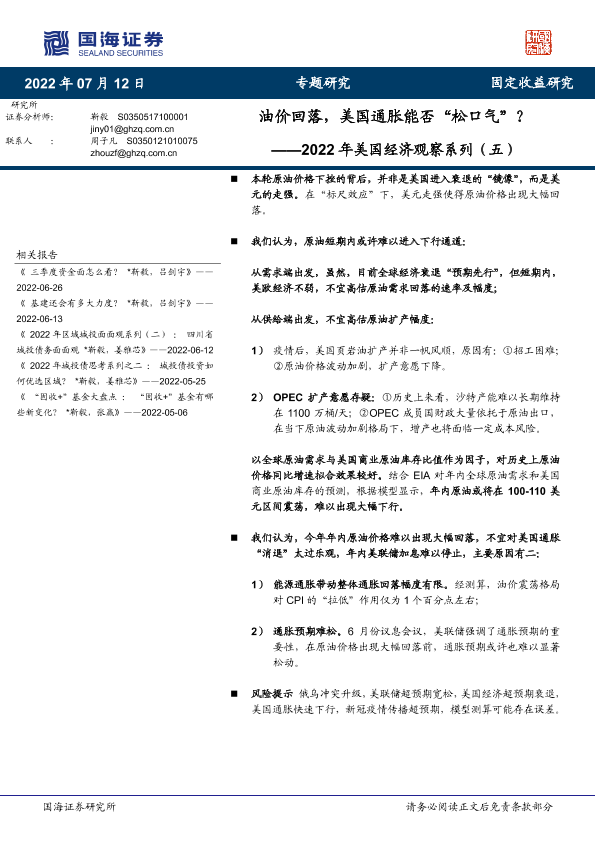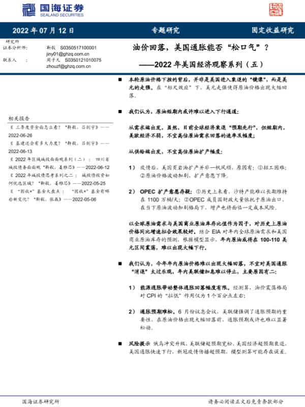【国海证券】【20220712】2022年美国经济观察系列(五):油价回落,美国通胀能否“松口气”?-15页
